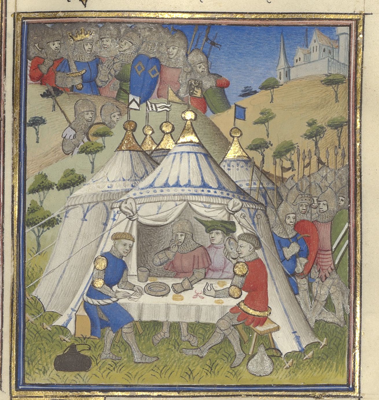 Parigi, Bibliothèque de l'Arsenal, 5193, f. 341r. Le truppe di Stilicone celebrano durante un banchetto nel loro accampamento, mentre Radagaiso e i suoi uomini rimangono affamati.