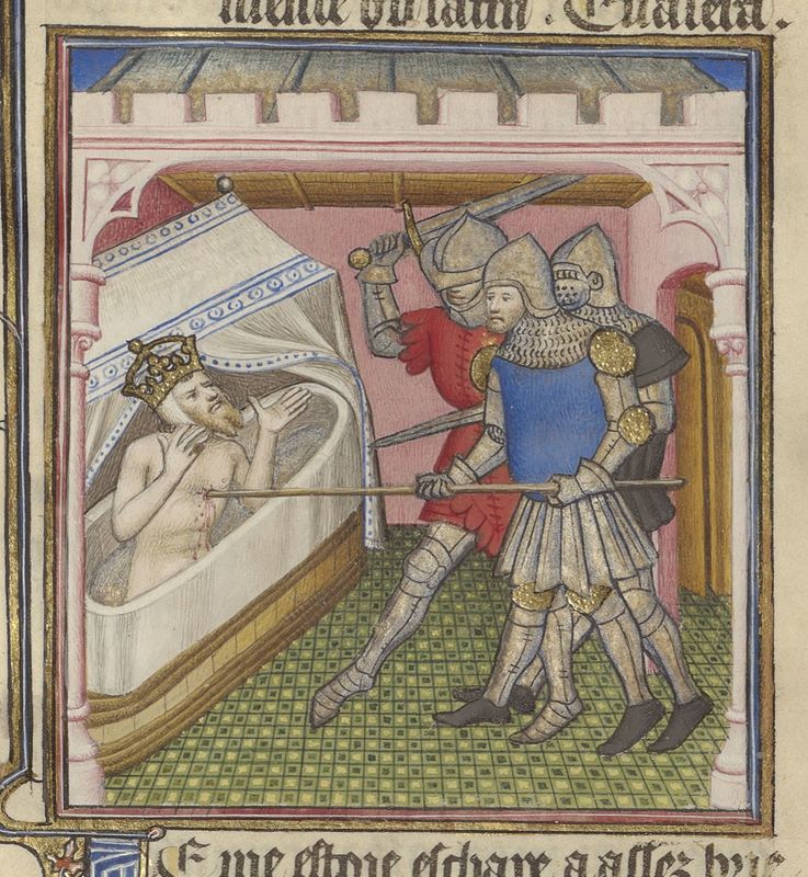 Parigi, Bibliothèque de l'Arsenal, 5193, f. 364v. Costantino III viene assassinato nella vasca da bagno da tre soldati.