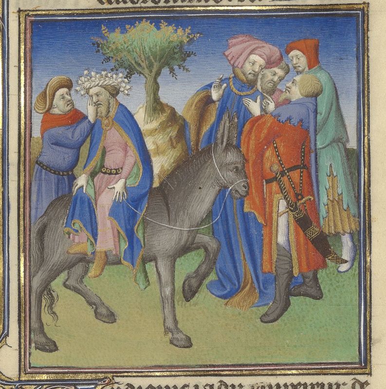 Parigi, Bibliothèque de l'Arsenal, 5193, f. 378r. L'imperatore Andronico viene legato al contrario sul dorso di un asino con una corona d'aglio in testa.