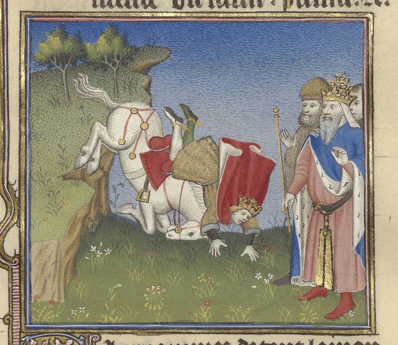 Parigi, Bibliothèque de l'Arsenal, 5193, f. 383r. Arrigo precipita da un dirupo con il suo cavallo; tre personaggi assistono alla scena.