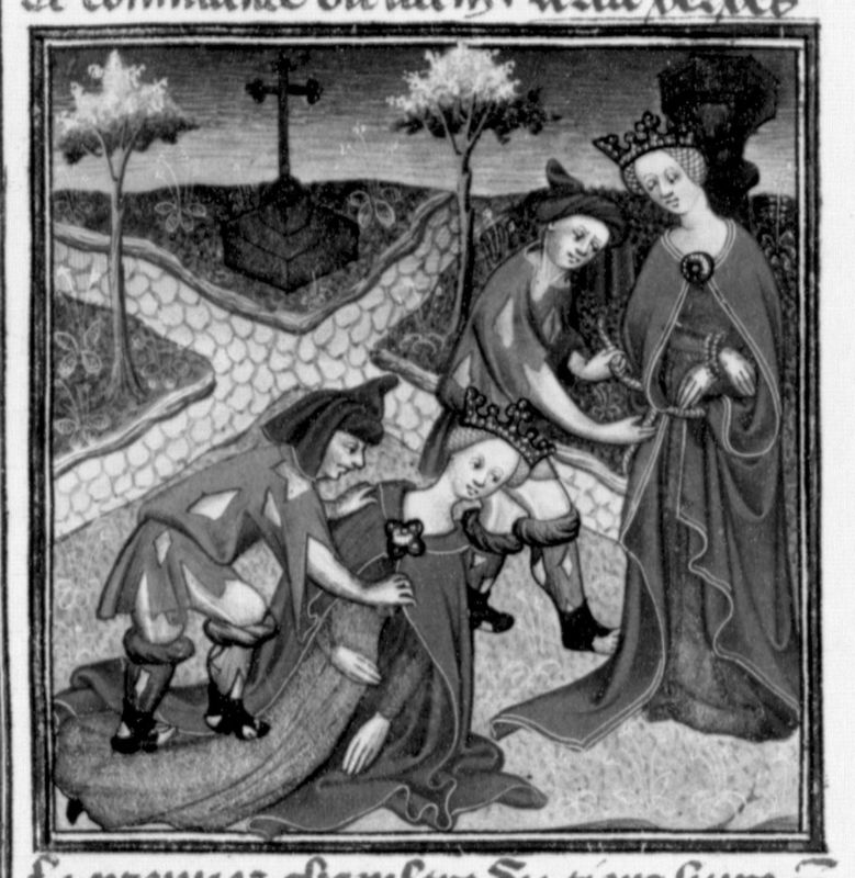 Parigi, Bibliothèque Nationale de France, Fr. 131, f. 71v. La Povertà, rappresentata come un uomo in abiti laceri, lotta ad un crocevia con la Fortuna, raffigurata come una dama dalle vesti eleganti; la Povertà lega la Fortuna ad una colonna.