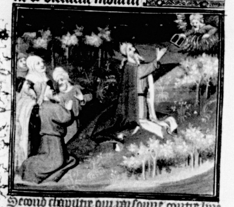 Parigi, Bibliothèque Nationale de France, Fr. 226, f. 8r. Mosè sale sulla cima del monte Sinai e riceve da Dio le Tavole della Legge.