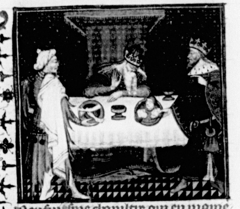 Parigi, Bibliothèque Nationale de France, Fr. 226, f. 15v. Durante un banchetto Atreo fa servire a Tieste i corpi dei suoi figli.