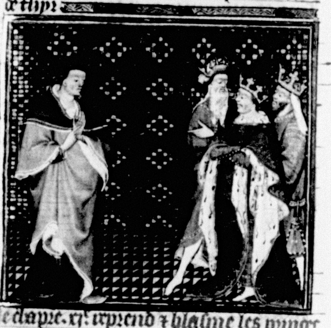 Parigi, Bibliothèque Nationale de France, Fr. 226, f. 19r. L'autore Giovanni Boccaccio incontra tre re.