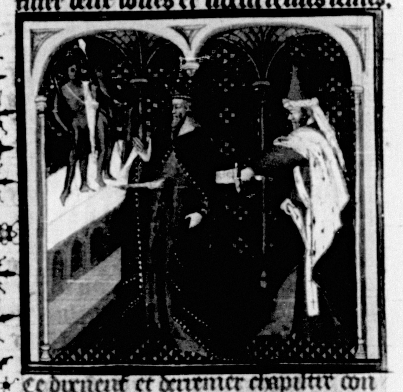Parigi, Bibliothèque Nationale de France, Fr. 226, f. 33v. Il sacerdote Macareo pugnala Neottolemo (Pirro) alla schiena mentre questi si trova dinanzi a un altare.