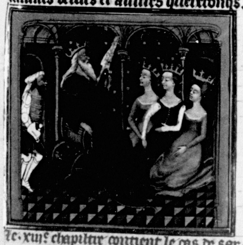 Parigi, Bibliothèque Nationale de France, Fr. 226, f. 46r. Sardanapalo fila con fuso e conocchia insieme alle sue donne.