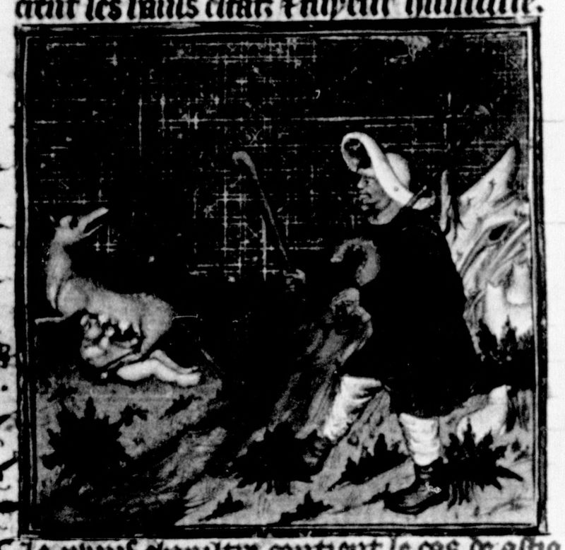 Parigi, Bibliothèque Nationale de France, Fr. 226, f. 52v. Un pastore trova il giovane Ciro allattato da una cagna.