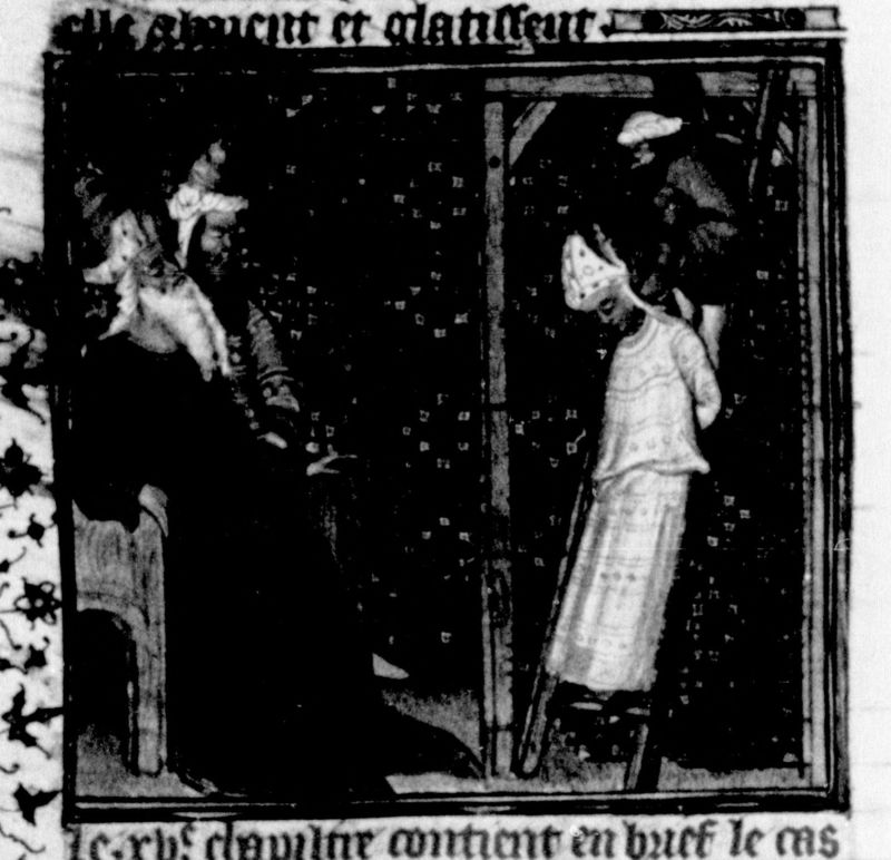 Parigi, Bibliothèque Nationale de France, Fr. 226, f. 88v. Malco fa impiccare suo figlio, il vescovo Cartalone.