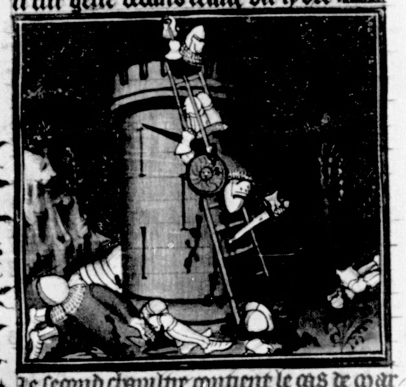Parigi, Bibliothèque Nationale de France, Fr. 226, f. 95v. Marco Manlio Capitolino respinge l'assalto dei Galli al Campidoglio (rappresentato come una torre).