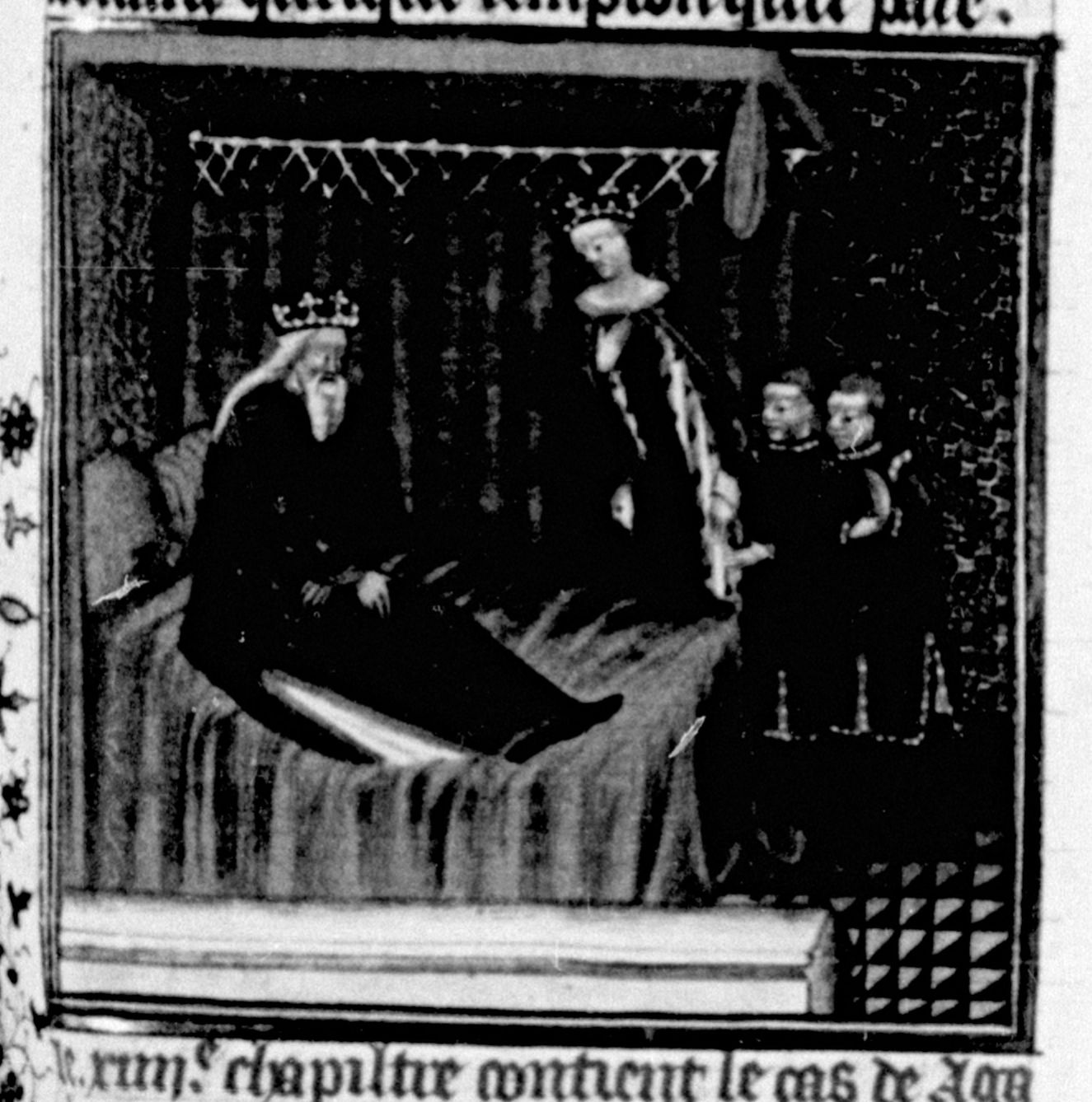 Parigi, Bibliothèque Nationale de France, Fr. 226, f. 112r. Agatocle sul letto di morte ordina alla moglie e ai figli di fuggire in Egitto.