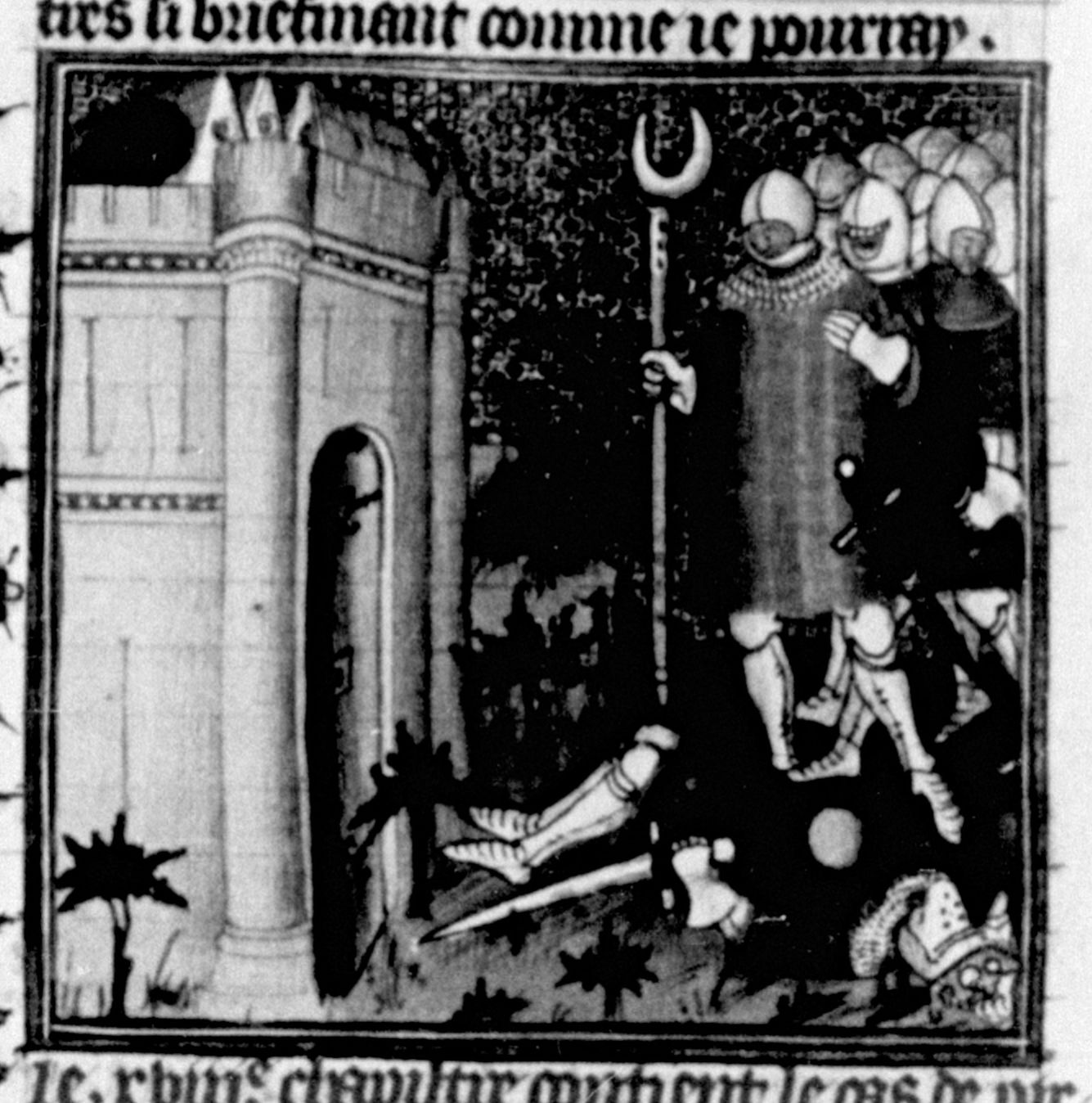 Parigi, Bibliothèque Nationale de France, Fr. 226, f. 121r. Durante l'assedio di Argo Pirro viene colpito a morte da un masso lanciato da una catapulta.