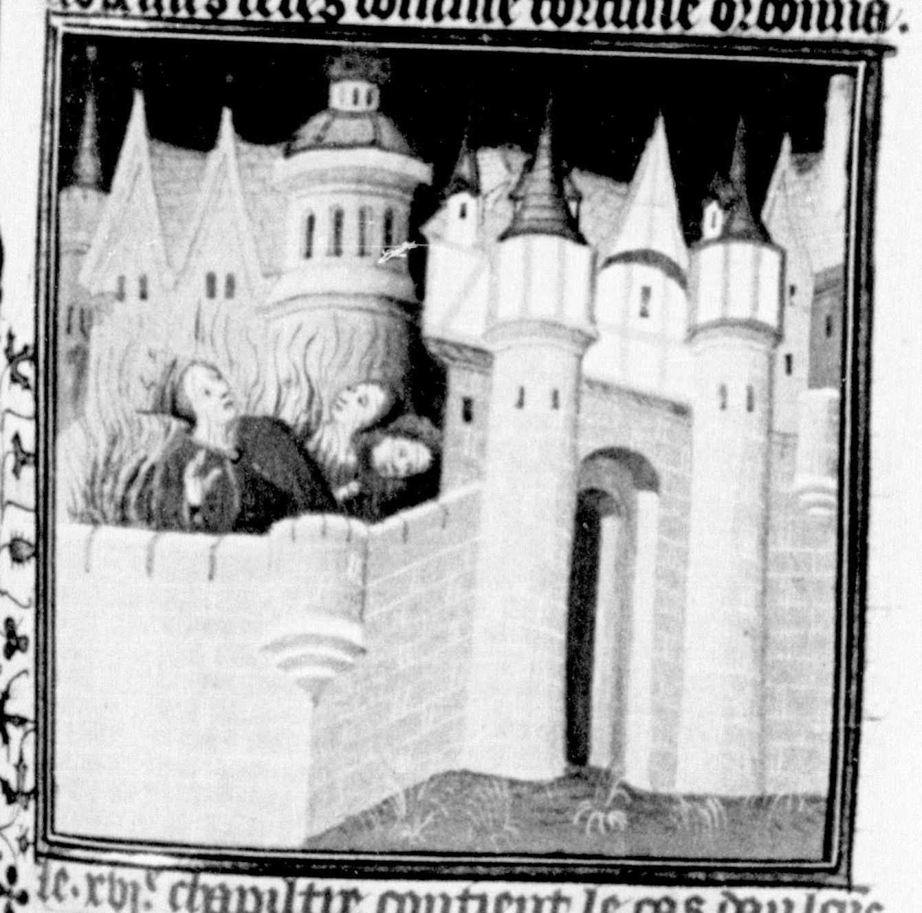 Parigi, Bibliothèque Nationale de France, Fr. 226, f. 147r. La moglie di Asdrubale si getta nel rogo insieme ai figli.