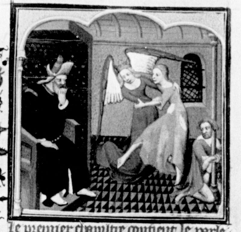 Parigi, Bibliothèque Nationale de France, Fr. 226, f. 154r. L'autore Giovanni Boccaccio seduto nel suo studio assiste alla lotta tra la Povertà e la Fortuna alata; la Sfortuna è legata ad un palo (modello mal compreso).