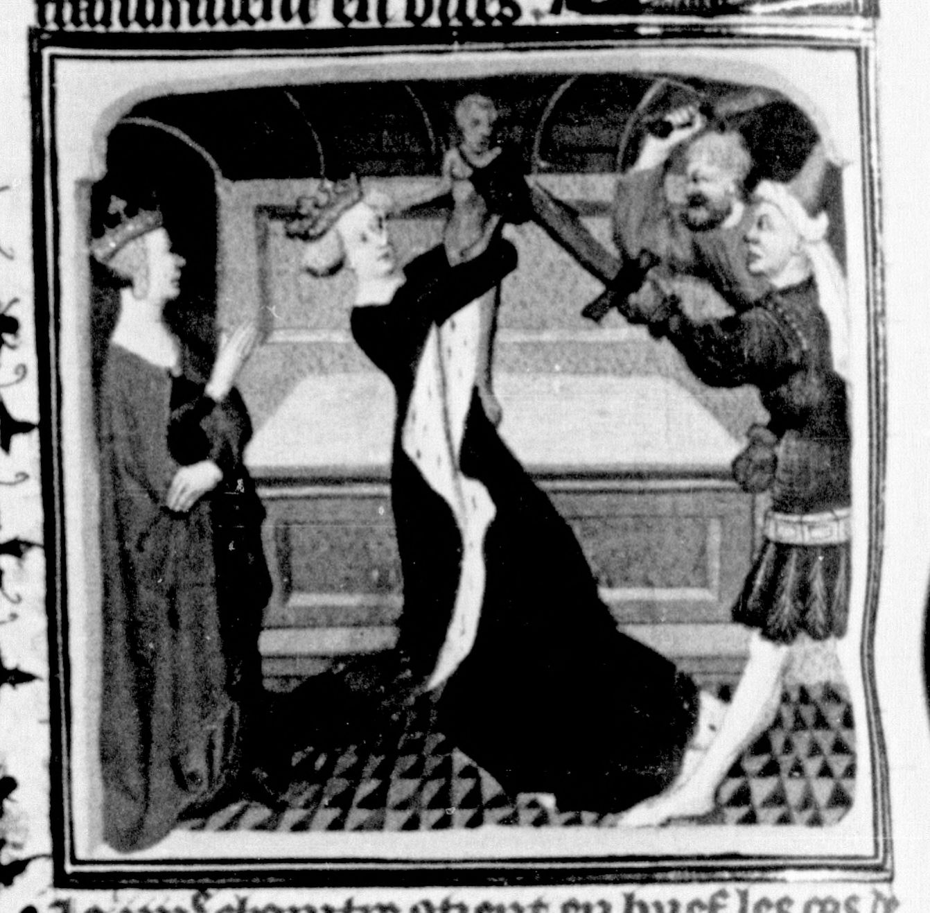 Parigi, Bibliothèque Nationale de France, Fr. 226, f. 161v. Cleopatra Trifene ordina l'assassinio della sorella Cleopatra IV, che all'arrivo dei soldati si aggrappa a una statua di Apollo.