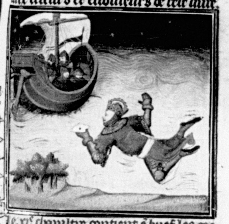Parigi, Bibliothèque Nationale de France, Fr. 226, f. 175r. Durante la battaglia di Faro, Cesare fugge a nuoto con una lettera in mano.