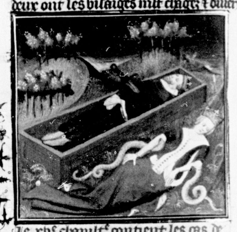 Parigi, Bibliothèque Nationale de France, Fr. 226, f. 183v. Il corpo di Antonio, trafitto da un pugnale, giace accanto a quello di Cleopatra, avvelenata da due aspidi.