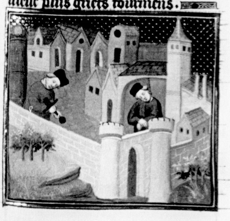 Parigi, Bibliothèque Nationale de France, Fr. 226, f. 224r. In seguito al suicidio del fratello Magnenzio, trafittosi con un pugnale, Decenzio si impicca in un palazzo.