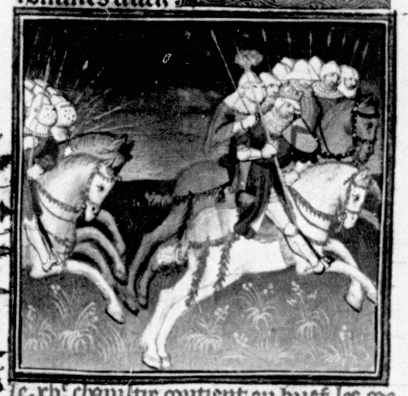 Parigi, Bibliothèque Nationale de France, Fr. 226, f. 260r. Guido di Lusignano e i suoi soldati fuggono inseguiti dall'esercito del Saladino.