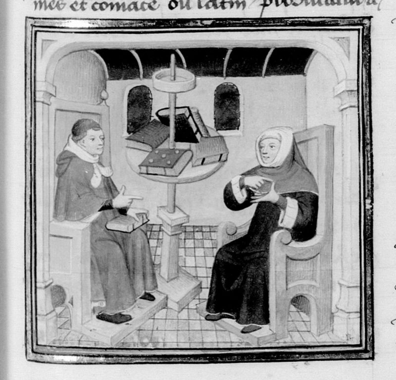 Parigi, Bibliothèque Nationale de France, Fr. 16994, f. 267r. Francesco Petrarca appare a Giovanni Boccaccio nel suo studio.