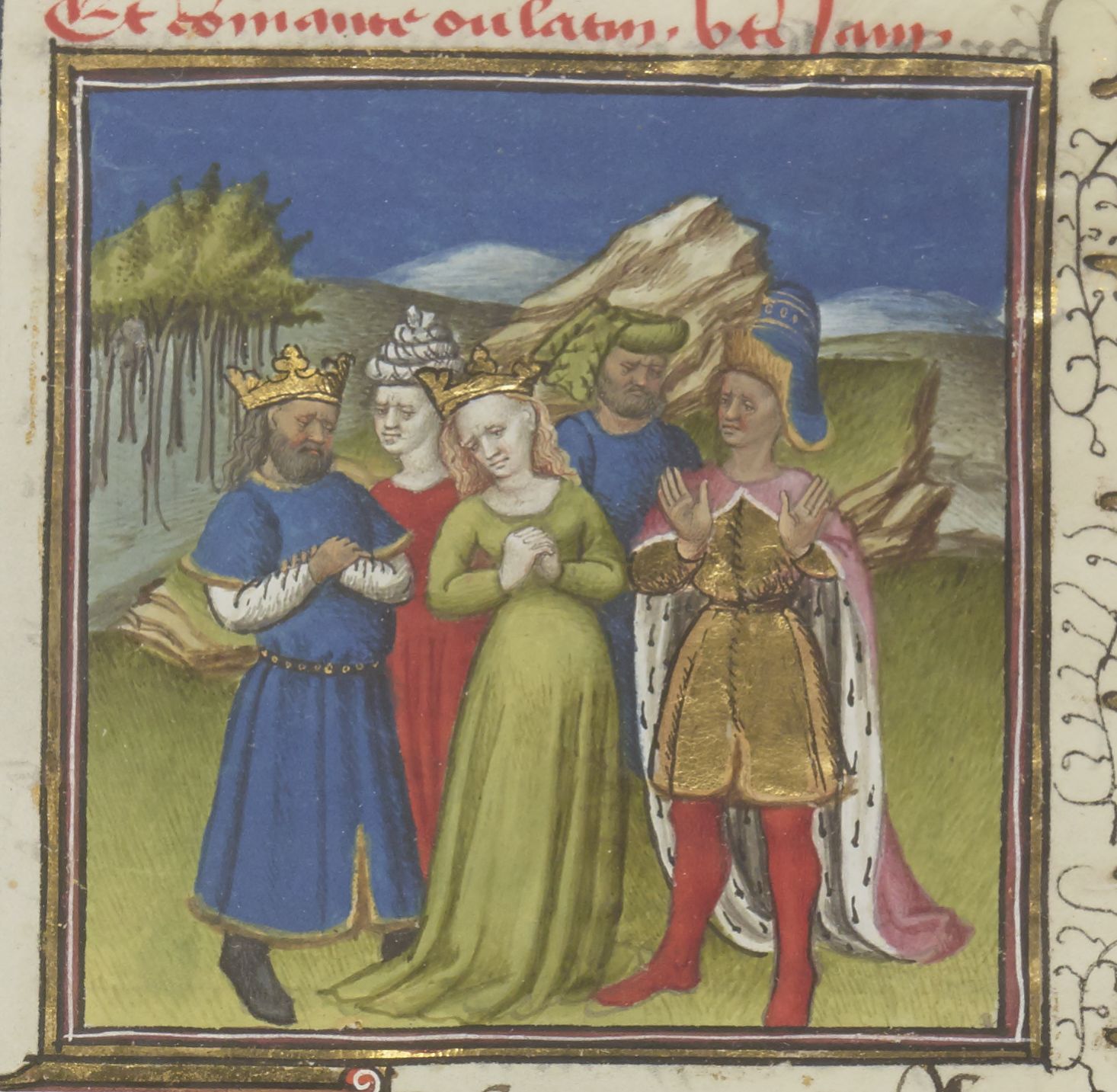 Parigi, Bibliothèque Nationale de France, Fr. 229, f. 12r. Il copista del manoscritto è Boniface de Remenant. Cinque personaggi dolenti, tra cui Eete, Medea e Minosse.