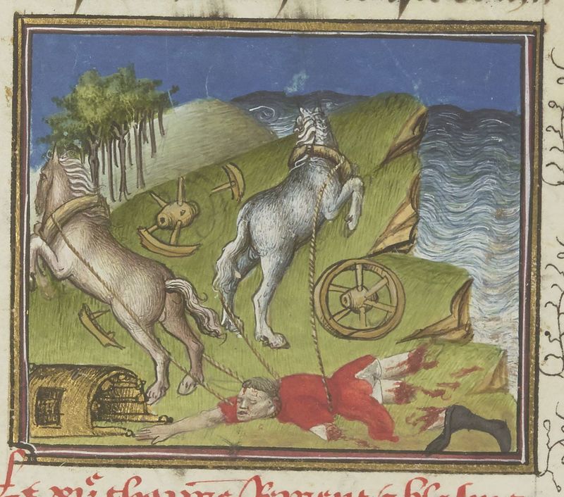 Parigi, Bibliothèque Nationale de France, Fr. 229, f. 21r. Il copista del manoscritto è Boniface de Remenant. Ippolito viene trascinato contro le rocce dai cavalli imbizzarriti.