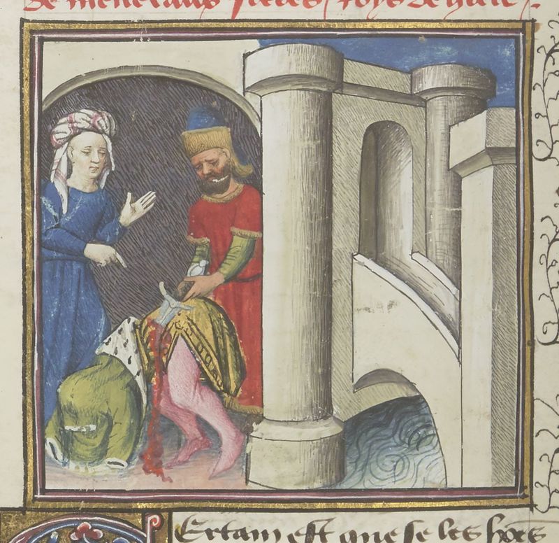 Parigi, Bibliothèque Nationale de France, Fr. 229, f. 32v. Il copista del manoscritto è Boniface de Remenant. Egisto uccide Agamennone con l'aiuto di Clitennestra, colpendolo alle spalle mentre si toglie il mantello.