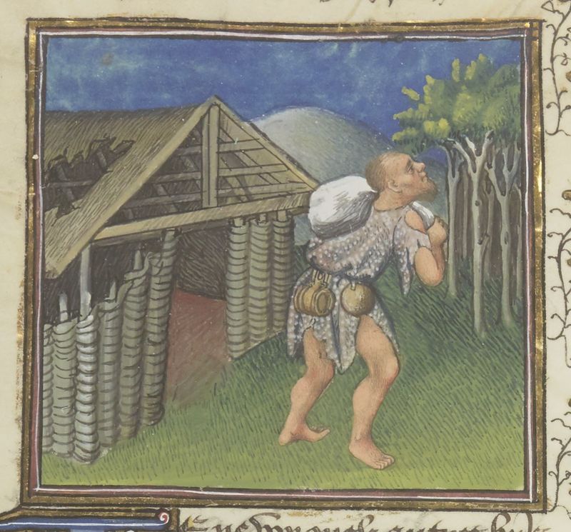Parigi, Bibliothèque Nationale de France, Fr. 229, f. 35v. Il copista del manoscritto è Boniface de Remenant. La Povertà, raffigurata come un povero viandante con un sacco in spalla.
