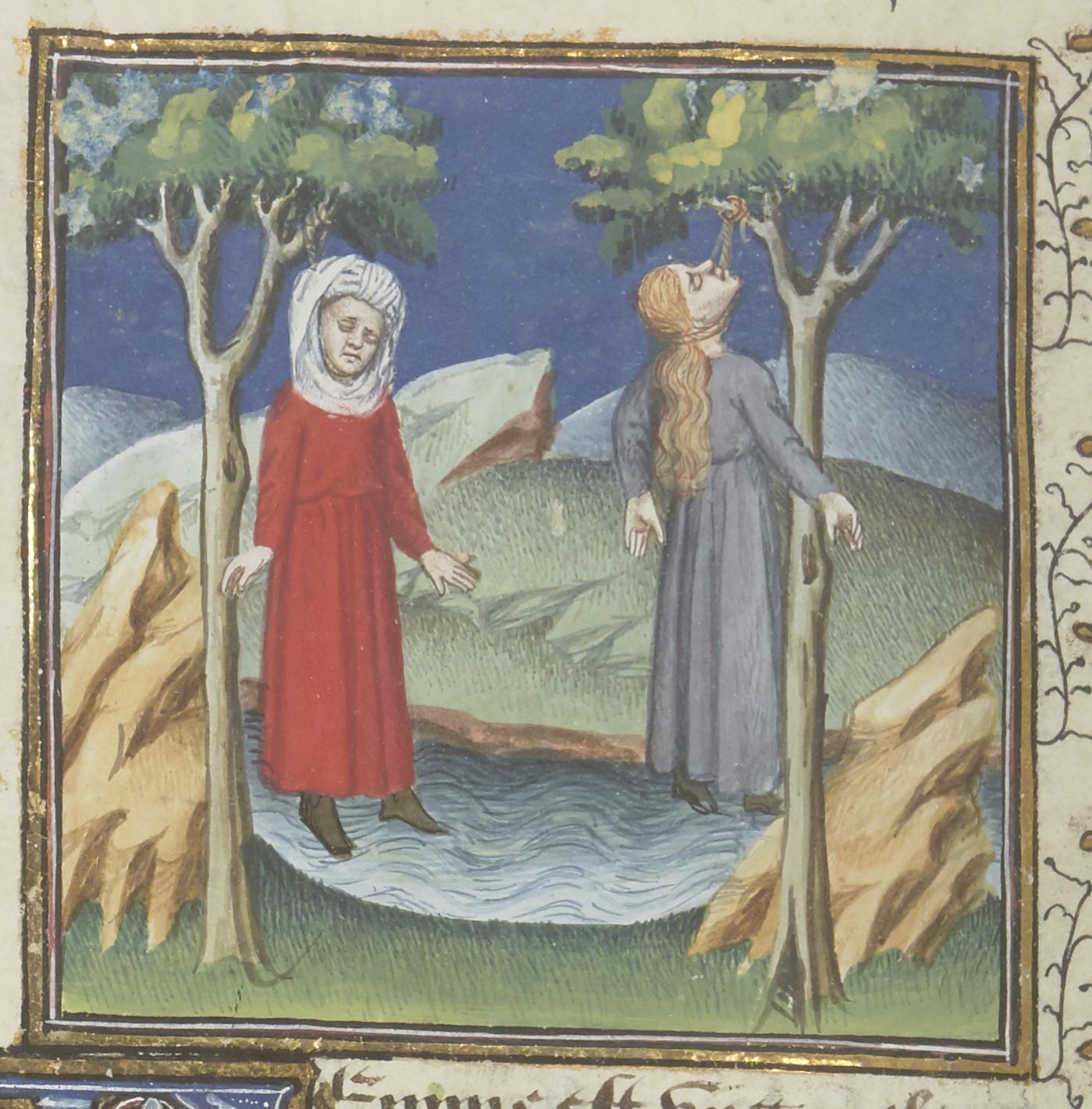 Parigi, Bibliothèque Nationale de France, Fr. 229, f. 38v. Il copista del manoscritto è Boniface de Remenant. Amata, moglie di re Latino, e Fillide, figlia di re Filleo, si impiccano a due alberi.