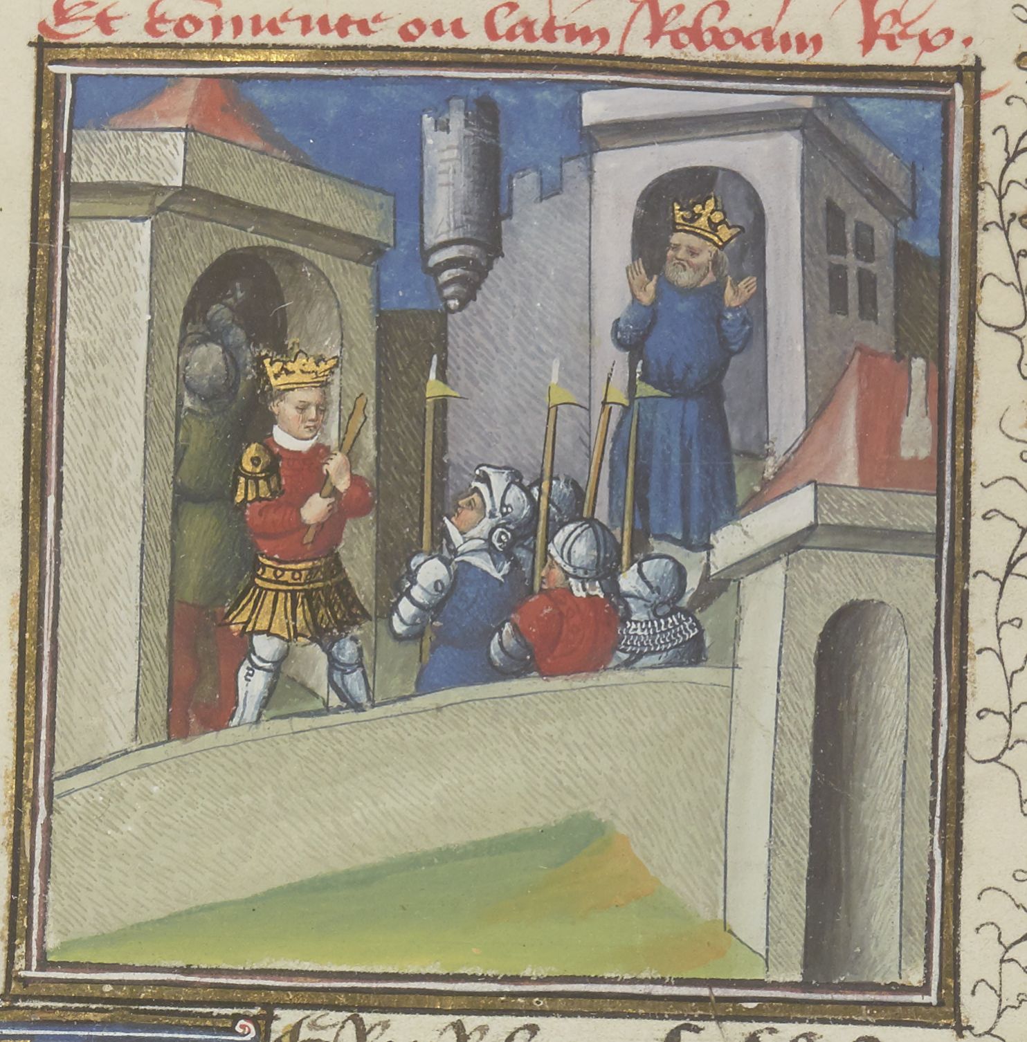 Parigi, Bibliothèque Nationale de France, Fr. 229, f. 48r. Il copista del manoscritto è Boniface de Remenant. Roboamo minaccia i suoi sudditi; re Geroboamo si mostra al popolo.