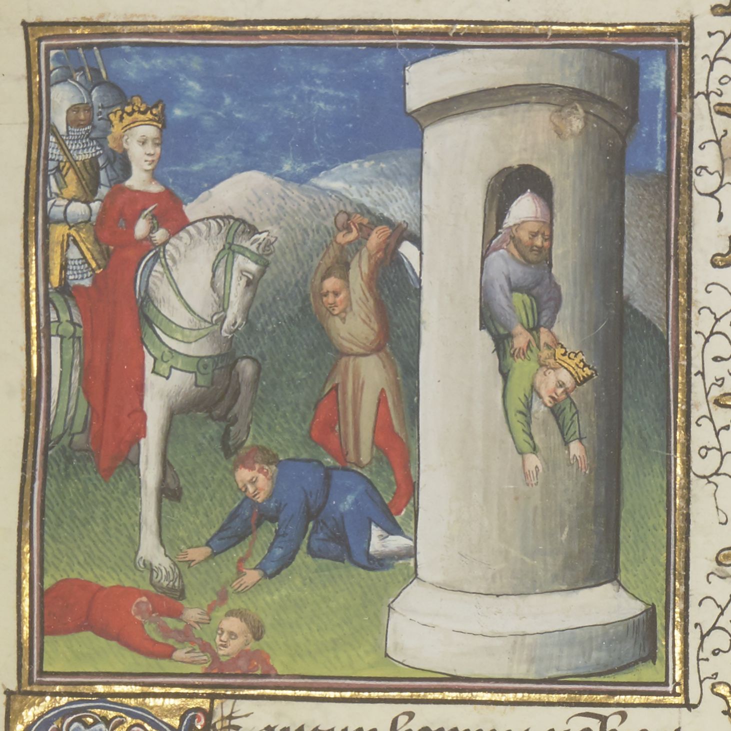 Parigi, Bibliothèque Nationale de France, Fr. 229, f. 55r. Il copista del manoscritto è Boniface de Remenant. Atalia, regina di Gerusalemme, ordina il massacro di tutti i discendenti maschi della stirpe di David; Gezabele, madre di Atalia, viene gettata da una finestra.