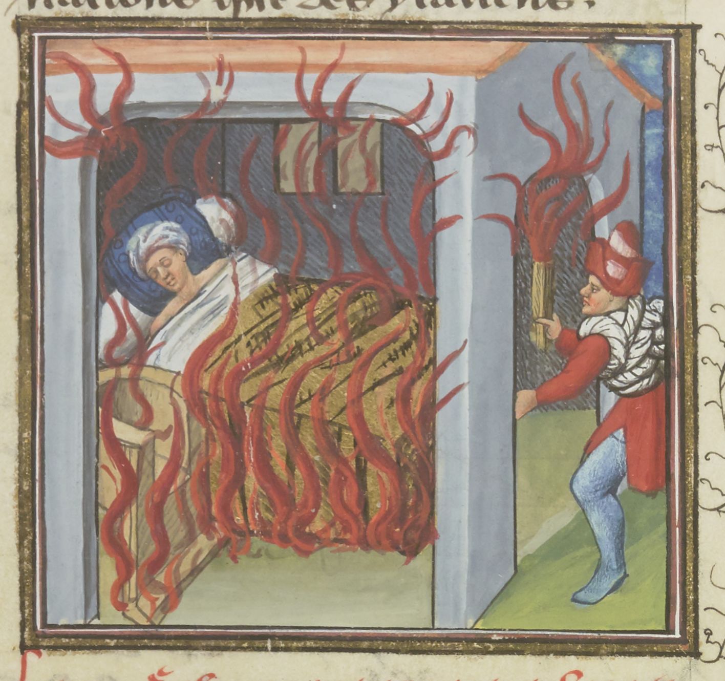Parigi, Bibliothèque Nationale de France, Fr. 229, f. 116v. Il copista del manoscritto è Boniface de Remenant. Un sicario ateniese armato di torcia dà fuoco alla camera dove dorme Alcibiade.