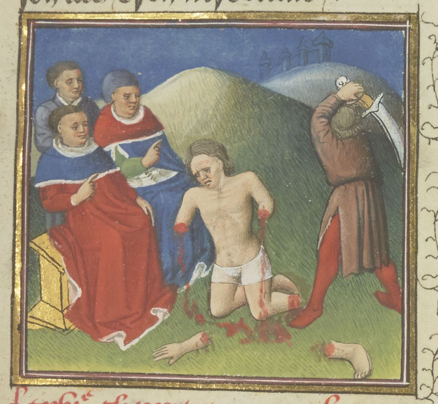 Parigi, Bibliothèque Nationale de France, Fr. 229, f. 124r. Il copista del manoscritto è Boniface de Remenant. I Cartaginesi fanno mutilare il generale Annone prima dell'esecuzione.