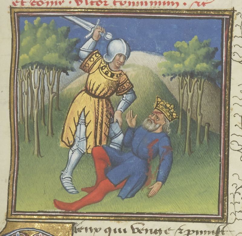 Parigi, Bibliothèque Nationale de France, Fr. 229, f. 204r. Il copista del manoscritto è Boniface de Remenant. Prusia II di Bitinia viene assassinato da suo figlio.