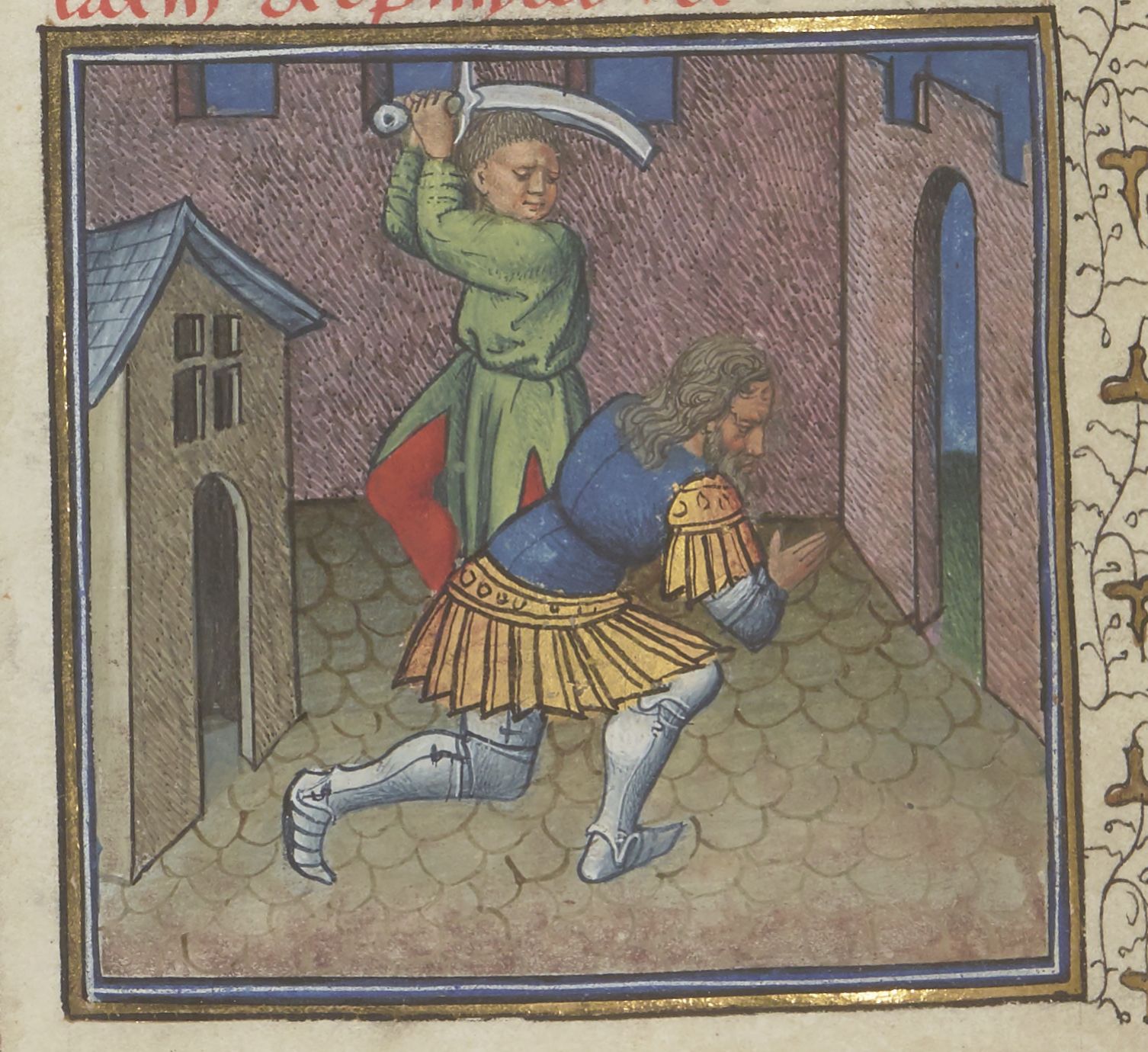 Parigi, Bibliothèque Nationale de France, Fr. 229, f. 226v. Il copista del manoscritto è Boniface de Remenant. Marco Mario, fratello di Gaio Mario, viene decapitato.