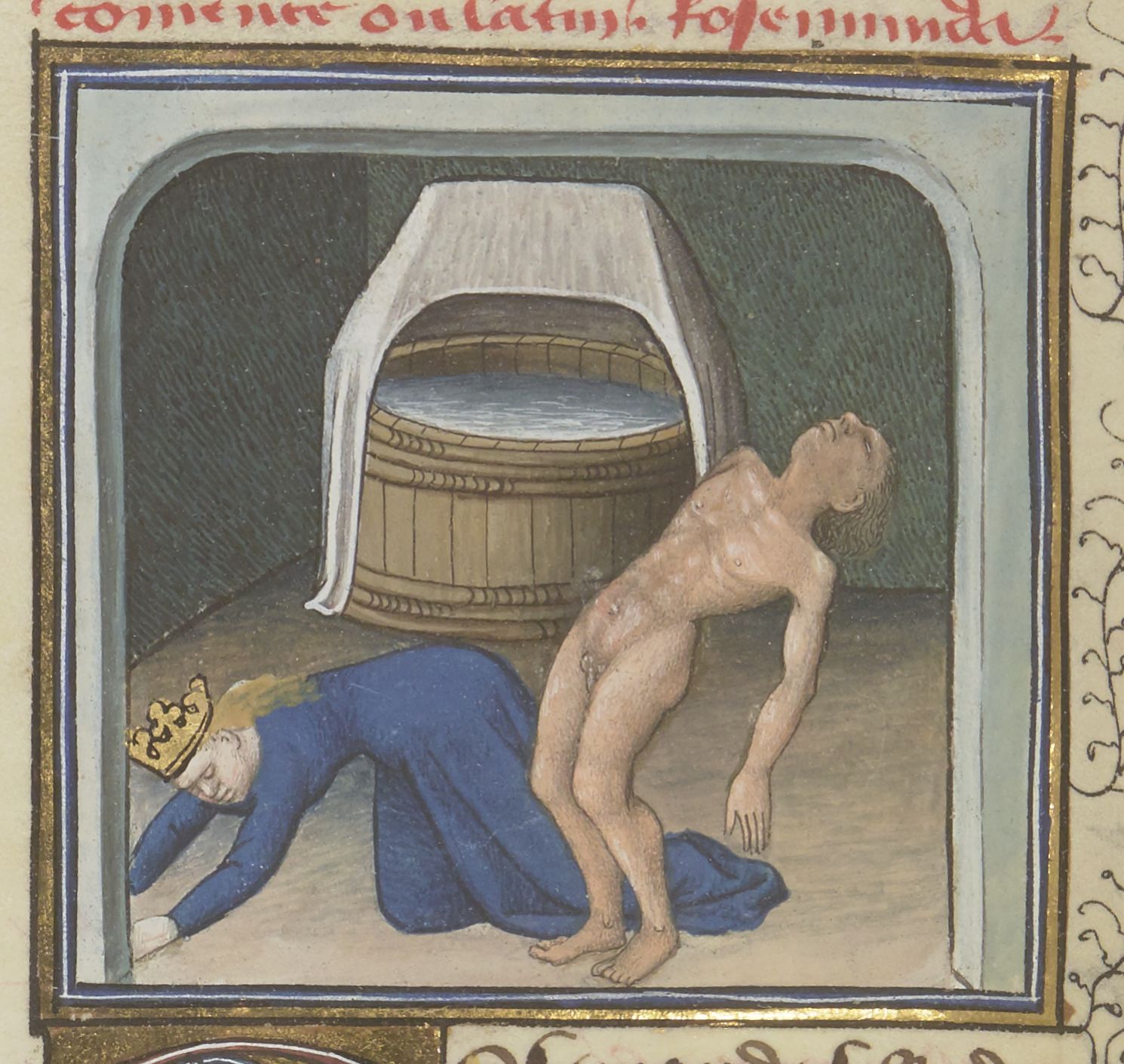 Parigi, Bibliothèque Nationale de France, Fr. 229, f. 347v. Il copista del manoscritto è Boniface de Remenant. La regina Rosmunda e lo scudiero Elmichi muoiono avvelenati nel bagno.