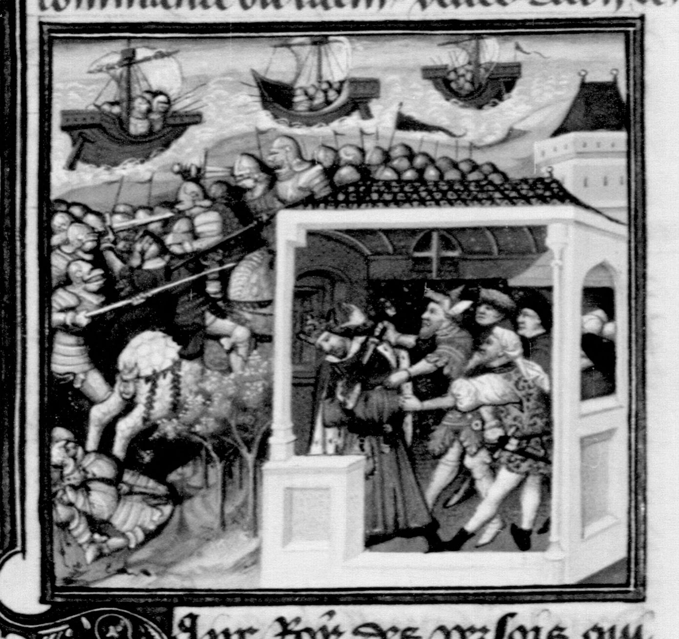 Parigi, Bibliothèque Nationale de France, Fr. 235, f. 103v. Serse viene ferito da Leonida durante una battaglia; Serse viene assassinato dalle sue guardie.