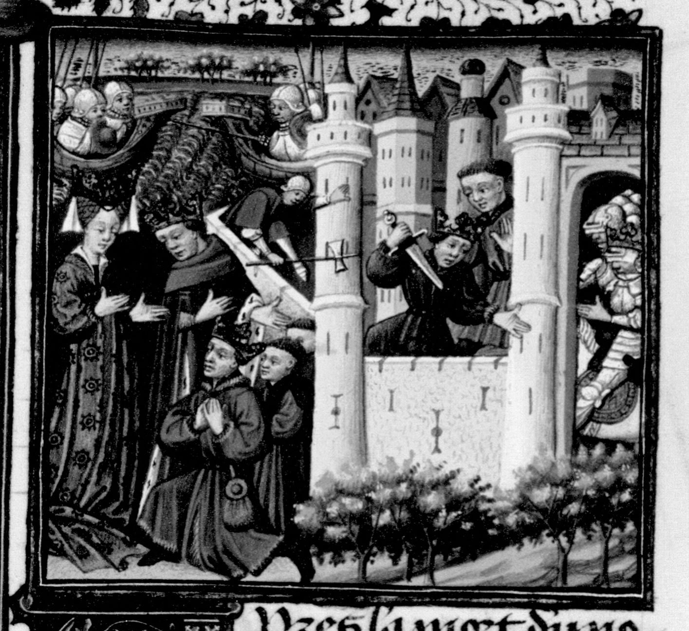 Parigi, Bibliothèque Nationale de France, Fr. 236, f. 94r. Marco Antonio presenta alla regina Cleopatra il prigioniero Artabano e i suoi figli; sullo sfondo due navi si affrontano nella battaglia di Anzio; Marco Antonio si pugnala per sfuggire ai soldati di Ottaviano.