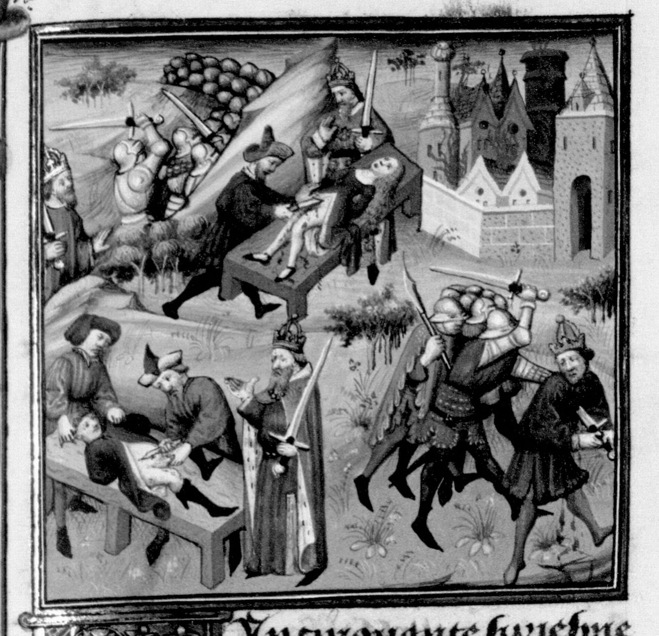 Parigi, Bibliothèque Nationale de France, Fr. 236, f. 113r. Nerone osserva mentre Sporo viene castrato e Agrippina viene squartata; l'incendio di Roma; Nerone, inseguito dai soldati, si trafigge con una spada.