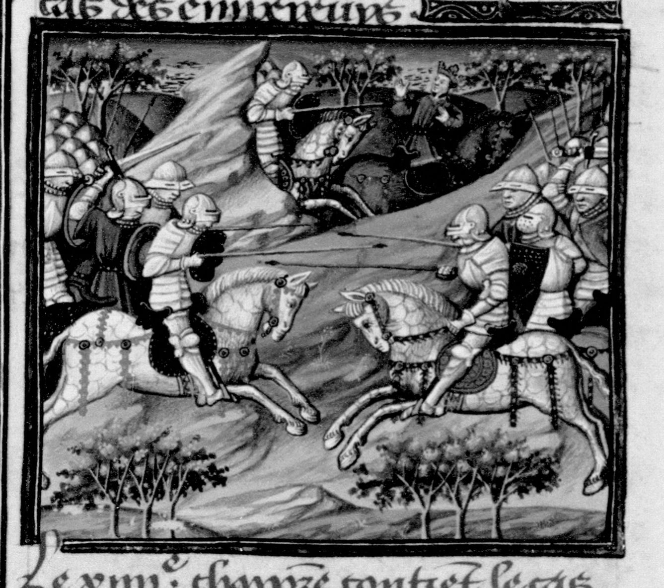 Parigi, Bibliothèque Nationale de France, Fr. 236, f. 166r. Gli eserciti di Radagaiso e Stilicone si scontrano; Radagaiso viene ucciso da un soldato.