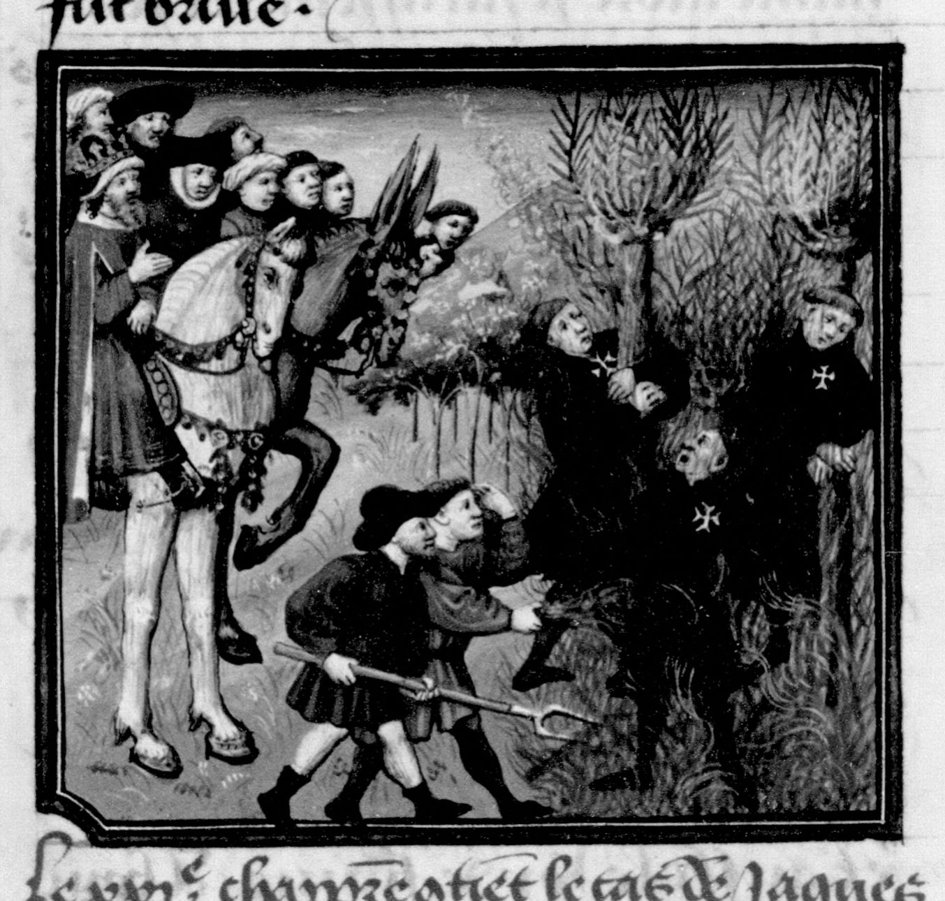 Parigi, Bibliothèque Nationale de France, Fr. 236, f. 215v. Filippo il Bello, seguito da una folla, fa ardere i cavalieri Templari sul rogo.
