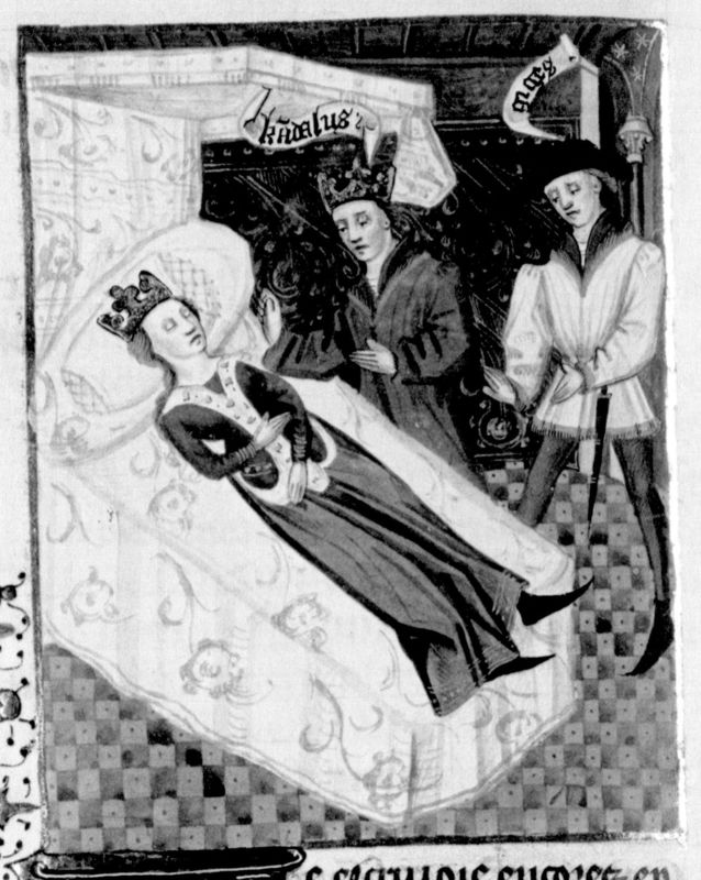 Parigi, Bibliothèque Nationale de France, Fr. 232, f. 61v. Re Candaule mostra a Gige la bellezza della moglie addormentata (qui rappresentata vestita per errore).