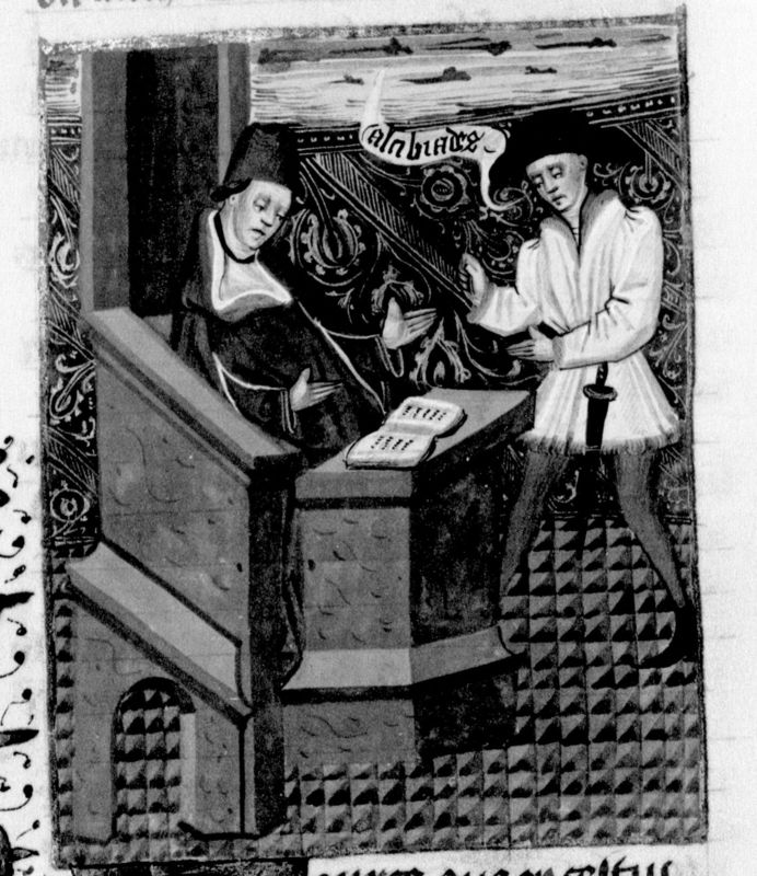 Parigi, Bibliothèque Nationale de France, Fr. 232, f. 100v. Giovanni Boccaccio, seduto in cattedra, conversa con Alcibiade.