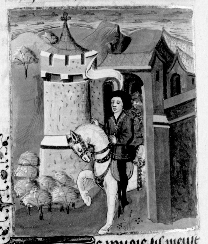 Parigi, Bibliothèque Nationale de France, Fr. 232, f. 116v. Pausania, esiliato da Sparta, lascia la città a cavallo.