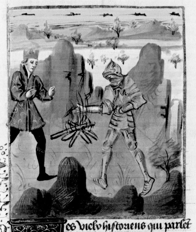 Parigi, Bibliothèque Nationale de France, Fr. 232, f. 336r. Muzio Scevola pone la mano destra sul fuoco al cospetto di Porsenna.