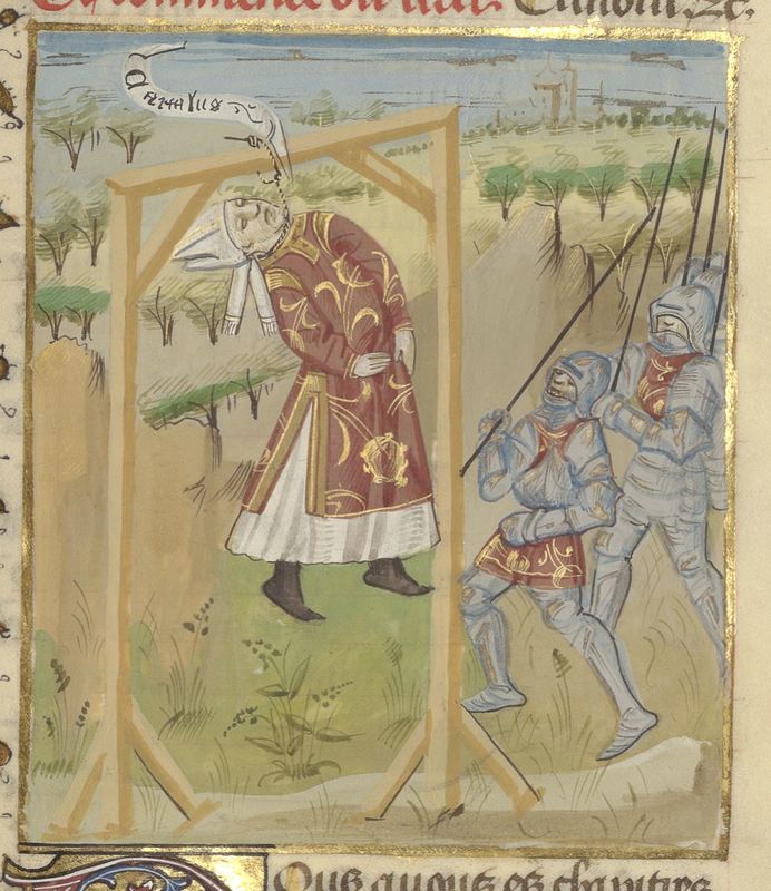 Parigi, Bibliothèque de l'Arsenal, 5192, f. 105r. Malco fa impiccare suo figlio, il vescovo Cartalone.