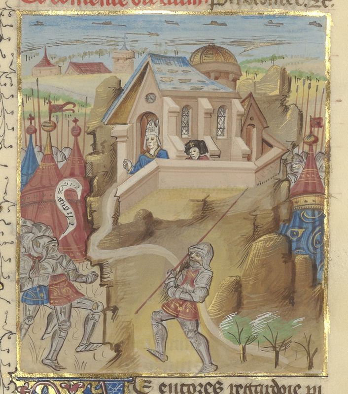 Parigi, Bibliothèque de l'Arsenal, 5192, f. 143r. Brenno si uccide dopo essere giunto al santuario di Apollo a Delfi (?).