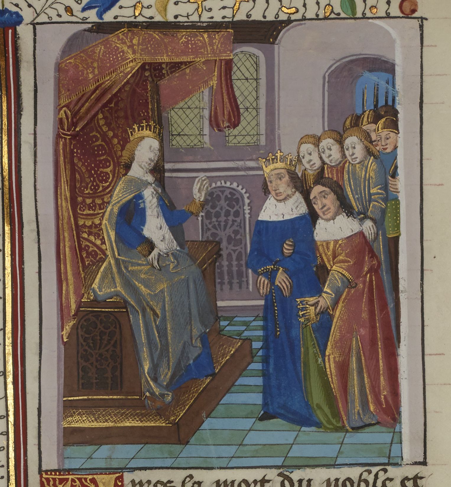 Parigi, Bibliothèque Nationale de France, Fr. 234, f. 104r. Marco Antonio presenta alla regina Cleopatra il prigioniero Artabano e i suoi figli.
