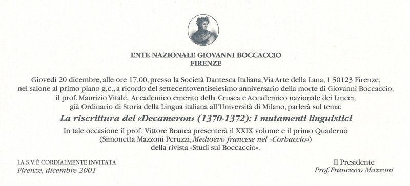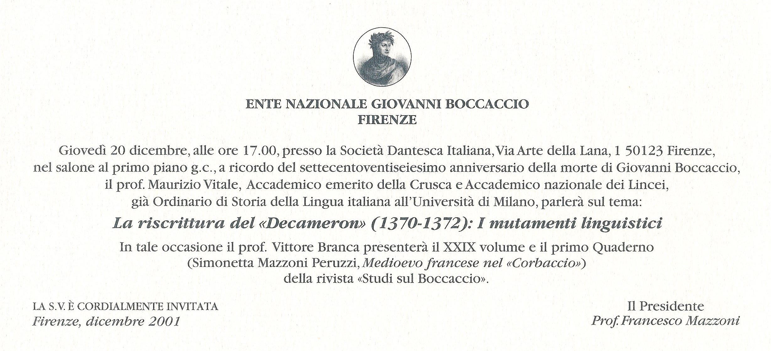 A ricordo del 726° anniversario della morte di Giovanni Boccaccio, il prof. Maurizio Vitale (Università di Milano) parlerà sul tema