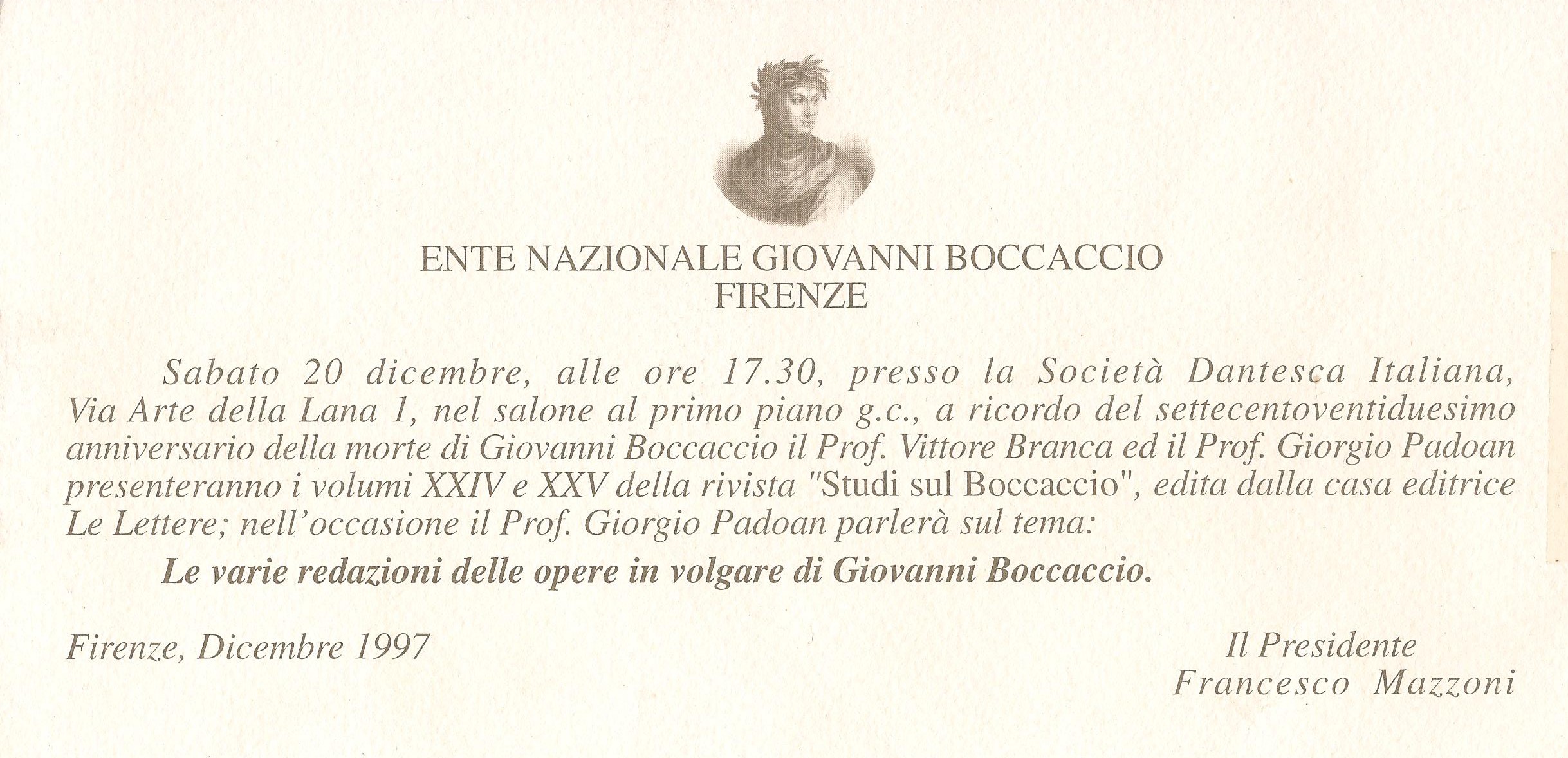 A ricordo del 722° anniversario della morte di Giovanni Boccaccio il prof. Giorgio Padoan parlerà sul tema