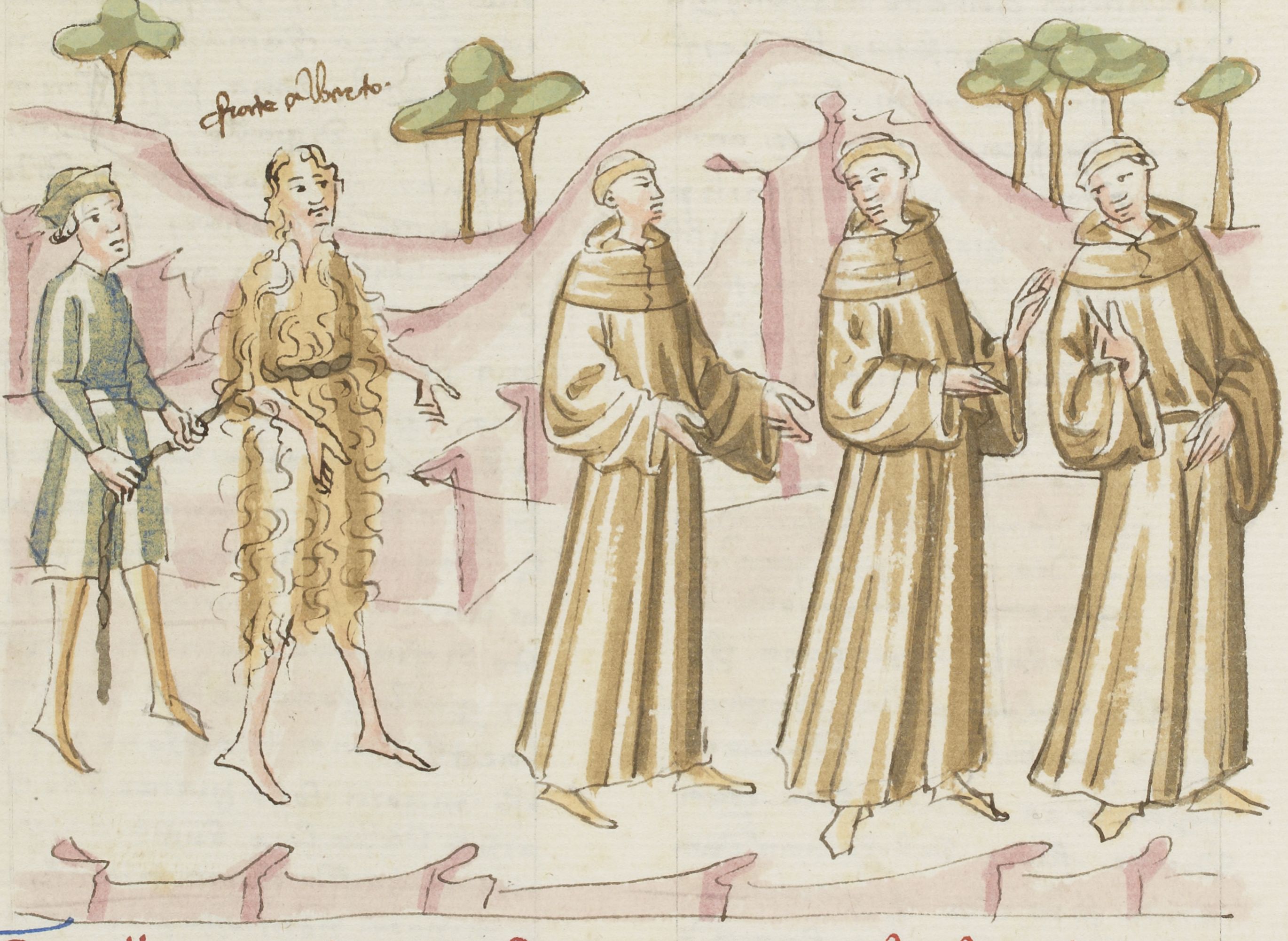 Parigi, Bibliothèque Nationale de France, It. 63, f. 138r. Il copista del manoscritto, datato 10 ottobre 1427, è Ludovico di Salvestro Ceffini. Frate Alberto, vestito da uomo selvatico, viene trascinato per strada e riconosciuto da tre frati.